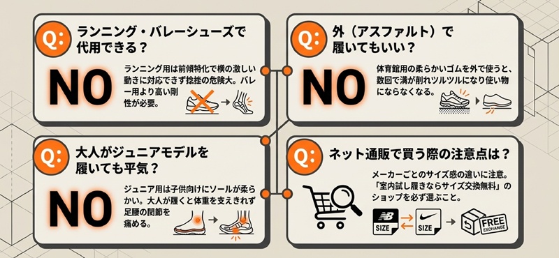 バッシュ選びに関して、初心者の方からよく寄せられる疑問をまとめました。代用品は使えるのか、外で履いてもいいのかなど、購入前に知っておきたい細かいポイントをQ&A形式で解消します。不安をなくして、自信を持ってシューズを選びましょう。