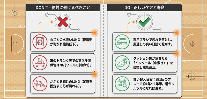 体育館用の柔らかいアウトソールをアスファルトで使うと、あっという間に溝が削れてツルツルになってしまいます。具体的には、数回の使用でグリップ力が失われ、体育館で使えなくなります。外でプレーする場合は、耐久性の高いゴムを使用した屋外専用モデルを選ぶことを推奨します。