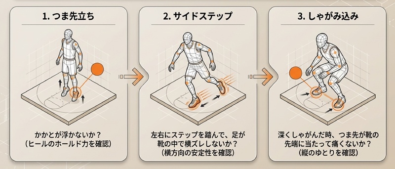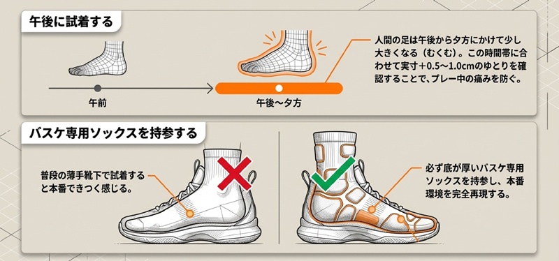 欲しいモデルが決まったら、最後は正しいサイズを見極めるフィッティングです。試着のやり方を間違えると後悔することになります。ここでは、お店で試着する際の時間帯や持ち物、確認すべき動作のポイント、そして買い替えのタイミングについて詳しく解説します。