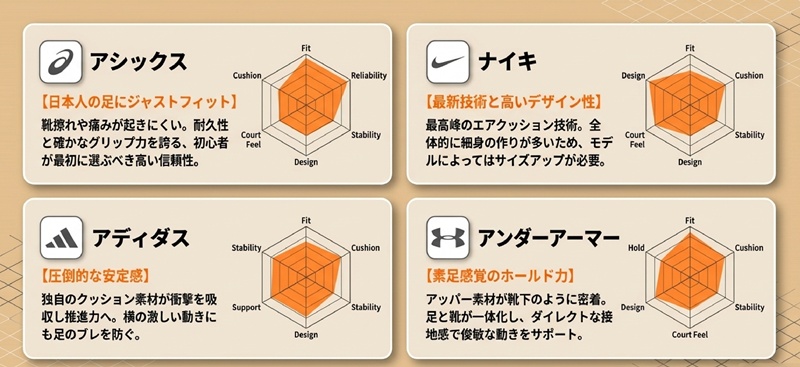 ここでは、アシックス、ナイキ、アディダス、アンダーアーマーの4大メーカーの具体的なメリットを比較し、あなたに合うブランドを見つけます。