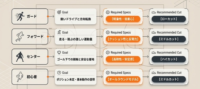これからバスケを始める方は、まだ自分のポジションが決まっていないことが多いでしょう。最初から特定の機能に特化した靴を選ぶと、かえって動きにくさを感じてしまう可能性があります。